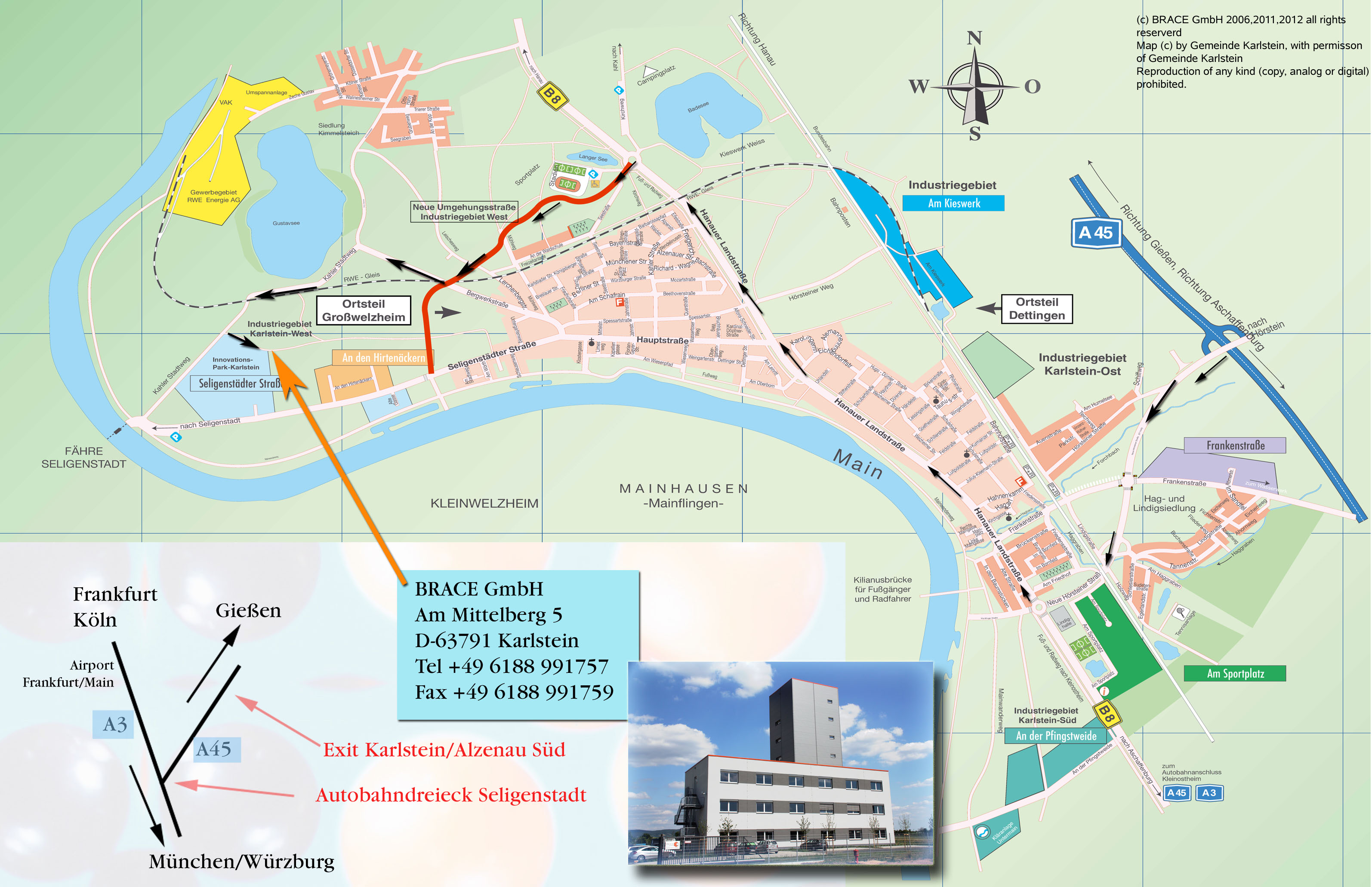 Für die Anfahrt mit dem Auto (auch empfehlenswert für eine Taxifahrt) verwenden Sie bitte die unten angezeigte Anfahrtsbeschreibung BRACE GmbH. Für GPS bitte "Kahler Stadtweg" in "Karlstein" eingeben, von dort ist das Gebäude bereits sichtbar. Mit einem click auf das Bild erhalten Sie eine größere Ansicht.