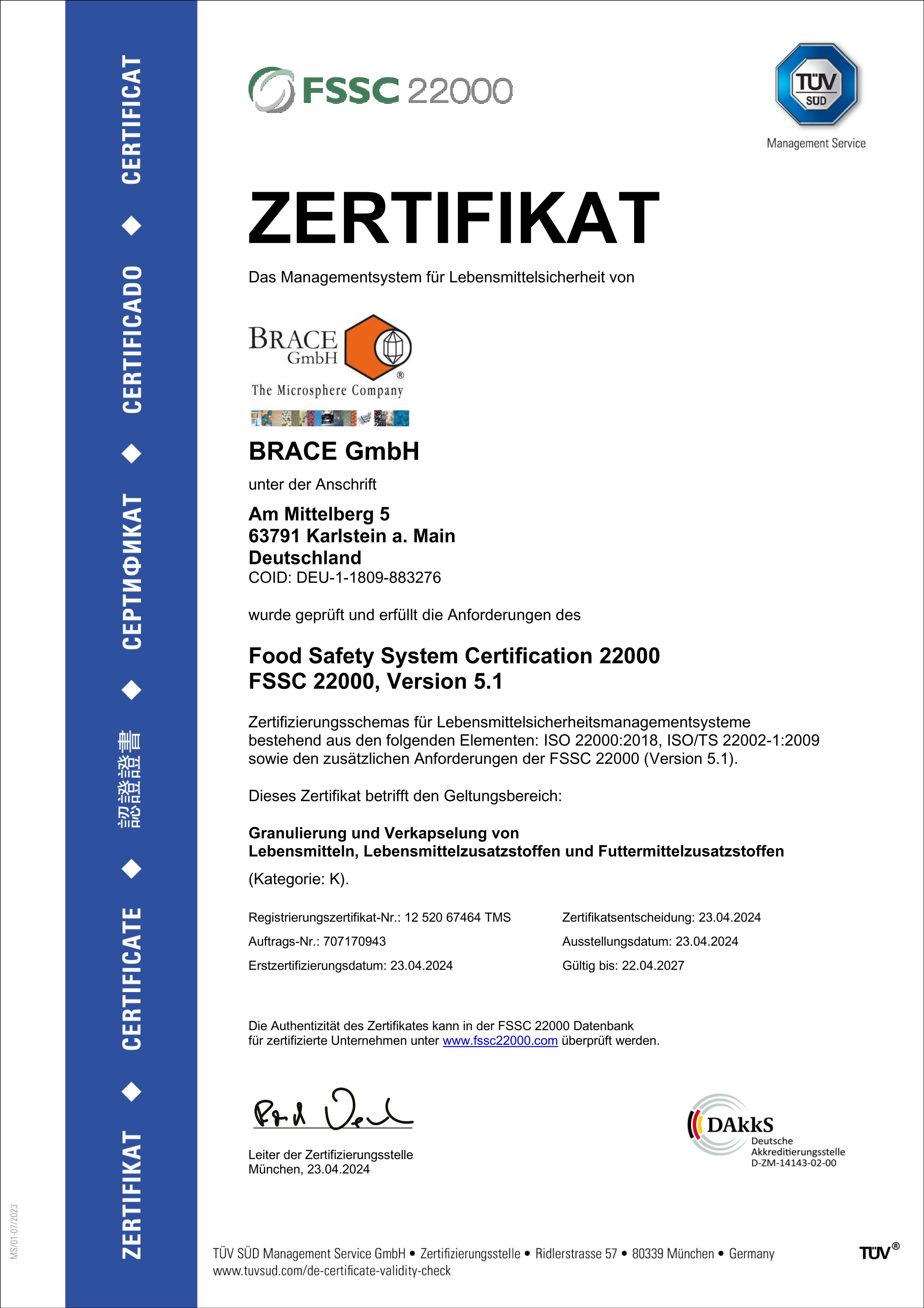 Für BRACE spiel seit jeher Qualität eine große Rolle. Daher ist BRACE ISO9001, HACCP, FSSC22000 und Ecovadis zertifiziert.