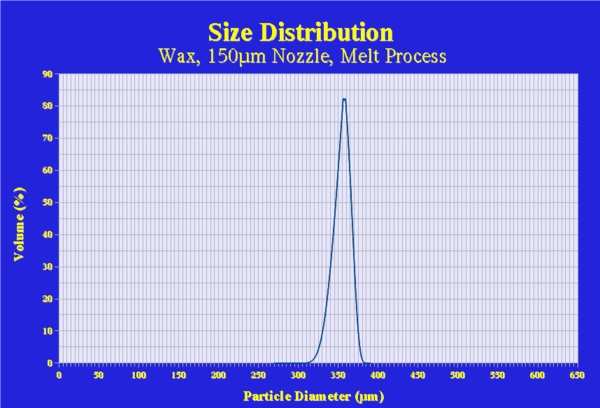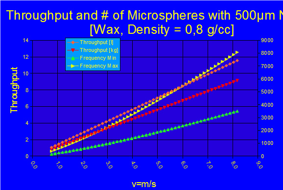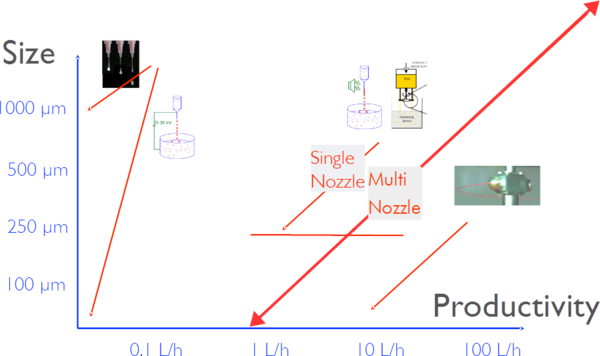 The capacity of the BRACE process depends on the materials and nozzle diameters to be used. In the figure below a wax material was measured with a 500 µm nozzle. Depending on the process parameters capacities as high as 12 L/h can be used. Scaling such a process means parameter adjustment but also numbering up of the nozzles. For the Spherisator M2 nozzle plates with hundreds of nozzles are available, scaling such throughputs linearly with the number of nozzles.
